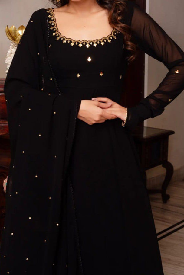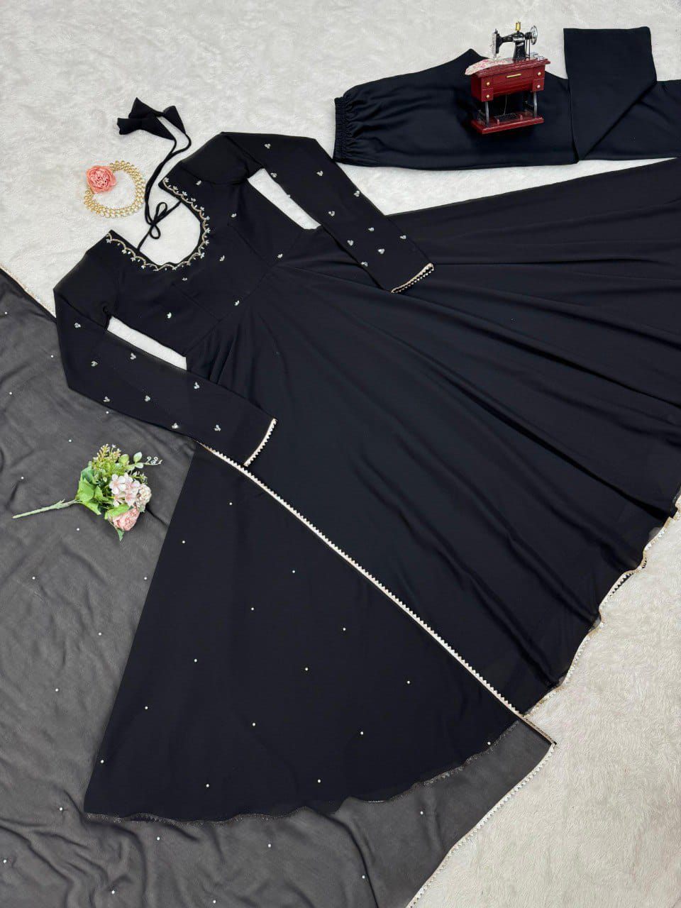 Party Wear Foux Georgette and Handwork with lace border Gown Pent & Rivet Moti with four side lace border Work Dupatta