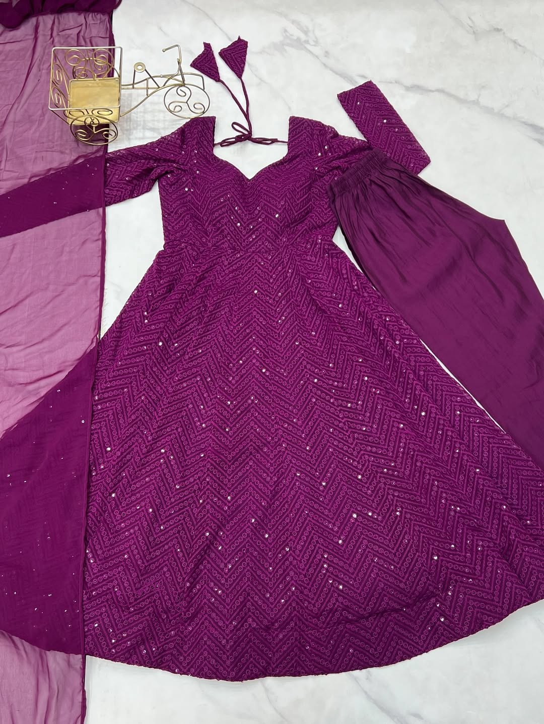 ✔️Anarkali Work : Lukhnowi Sequence Work ,full Length Sleeves,padded,zipper Attached Complete