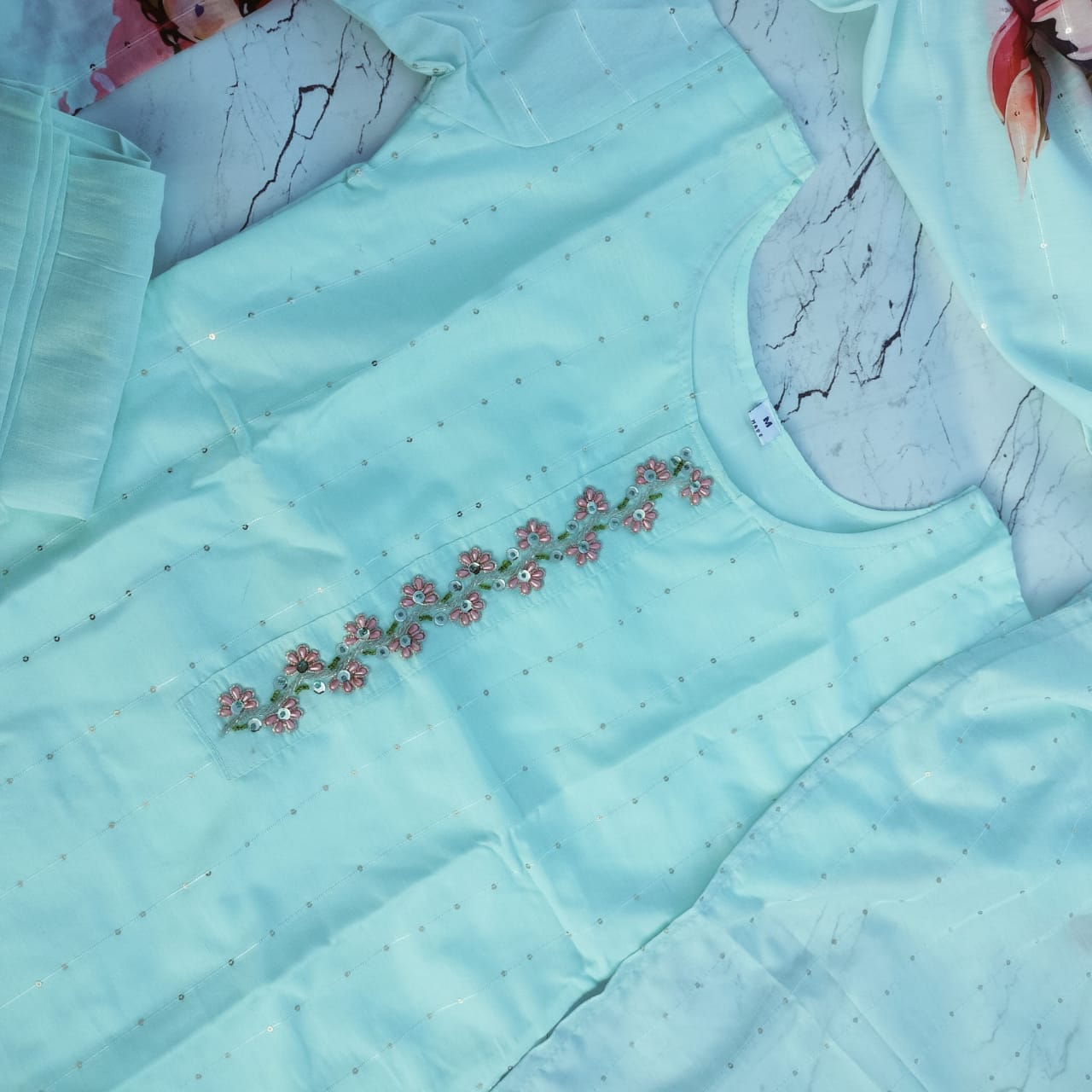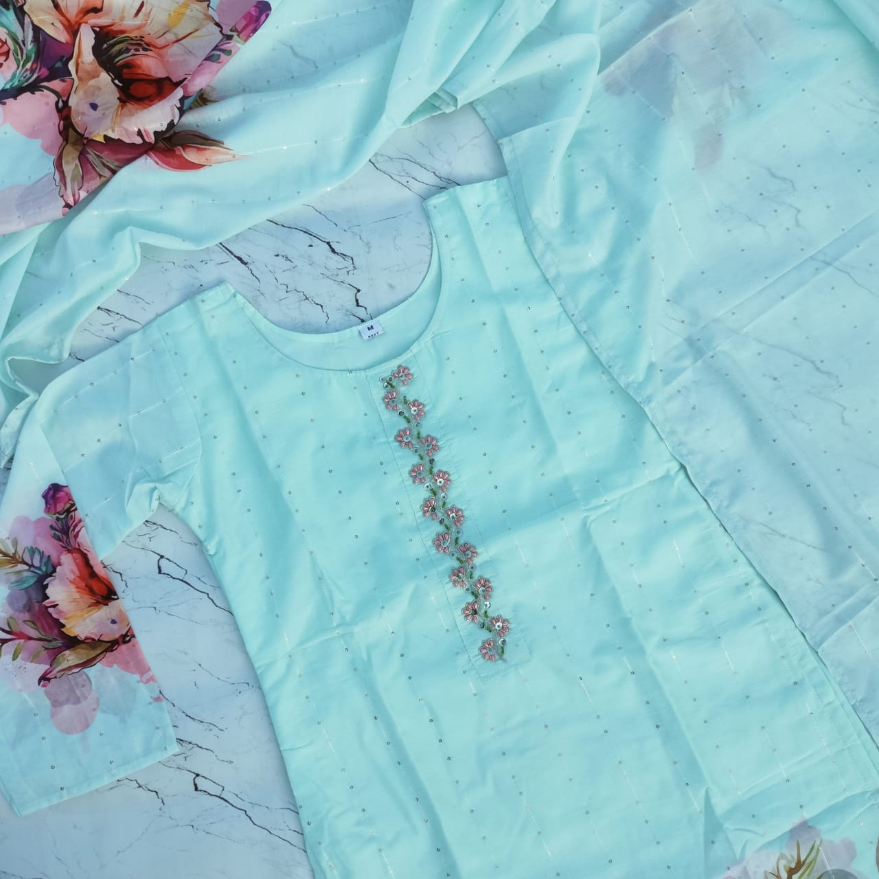 - Fabric: Coordinating lightweight dupatta with matching floral prints on the borders, completing the elegant look.