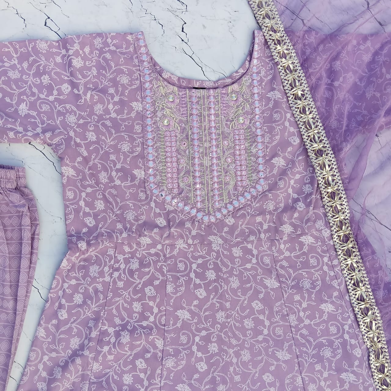 This elegant three-piece suit set features a stunning lavender base with intricate white floral prints and golden accents for a sophisticated ethnic look. The set includes: