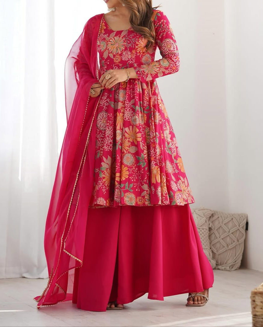 Haldi Special Digital Print Work With Padded, Side Zipper, Bottom Canvas Patt Kediya Kurti ,Palazzo & Lace Border Work Dupatta