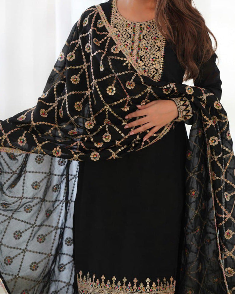 Heavy Pure Blooming Vichitra Silk and Embroidery Sequence And Dori Thread Work Top Pent & Dupatta