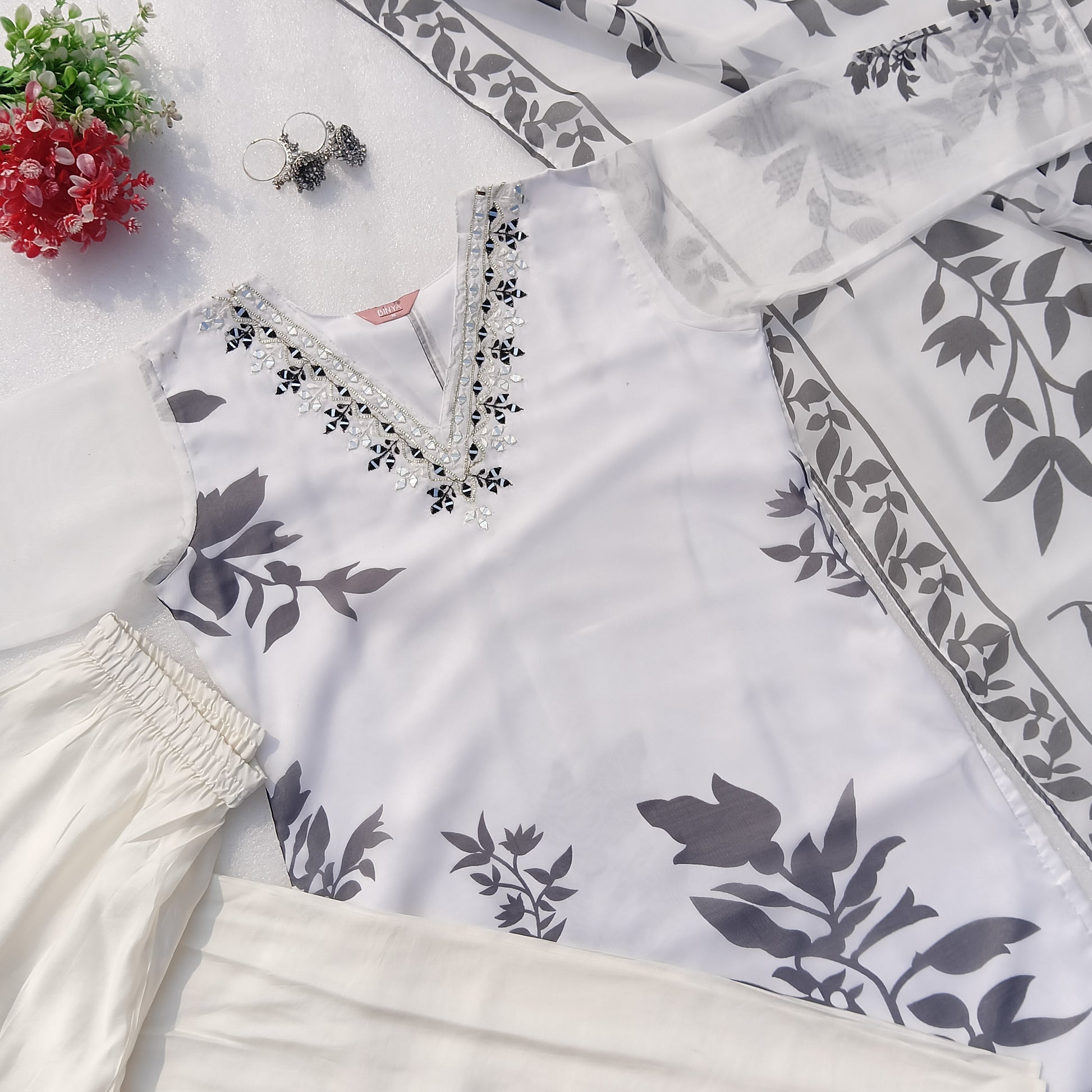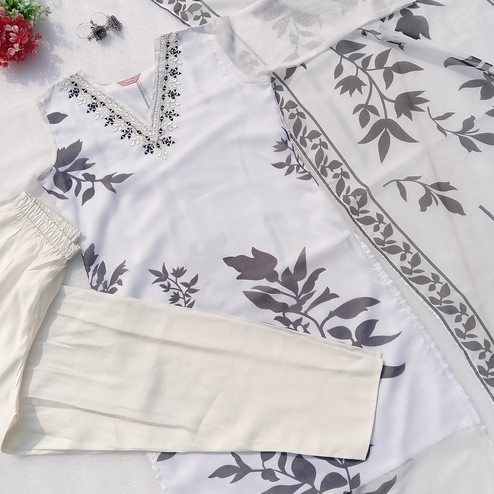 Kurti: The Kurti is made of organza fabric, featuring a white base adorned with soft Black floral prints. The V-shaped neckline is beautifully embellished with intricate mirror work, adding a touch of sparkle and glamour to the design. The sheer organza fabric gives the Kurti a lightweight and flowy look, perfect for semi-formal occasions.